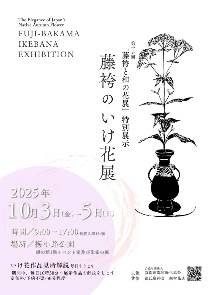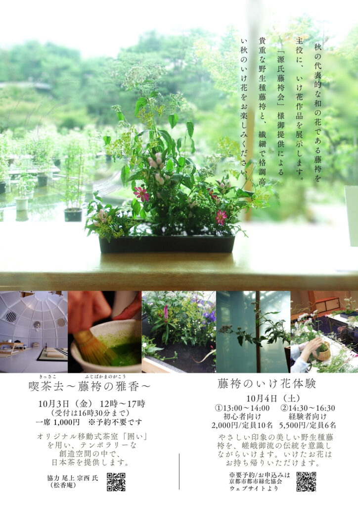 梅小路公園にて毎年開催されている「藤袴と和の花展」にて、「藤袴のいけ花展」を特別展示させて頂きます。寺町通の革堂行願寺を中心に活動されている「源氏藤袴会」さんご提供による、絶滅寸前の貴重な野生種藤袴を主役に、秋らしさを存分に楽しんでいただけるいけ花作品ばかりを選りすぐって展示させて頂きます。